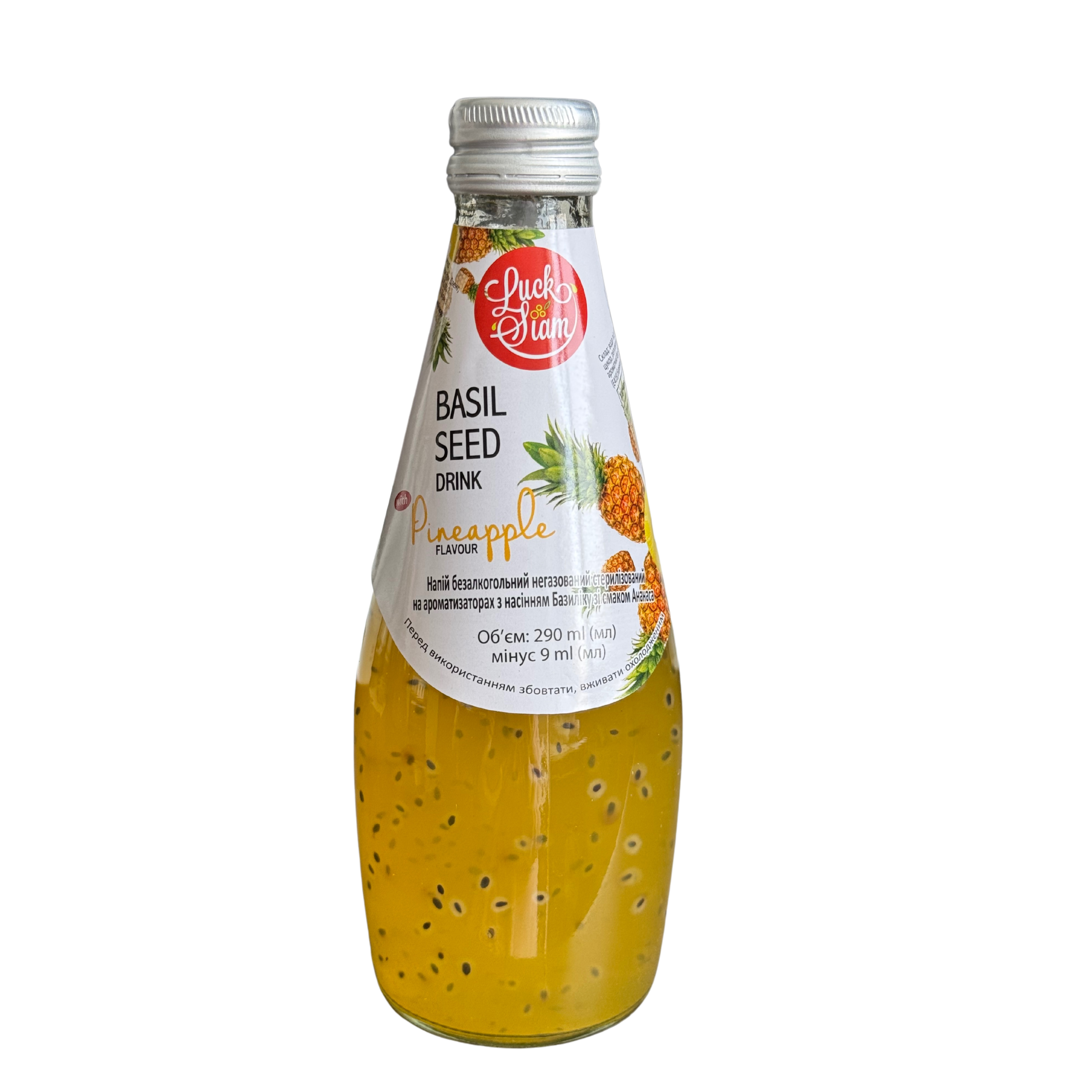 Напій безалкогольний нагазований стерилізований з насінням Базиліку зі смаком Ананаса. Перед використанням збовтати, вживати охолодженим.