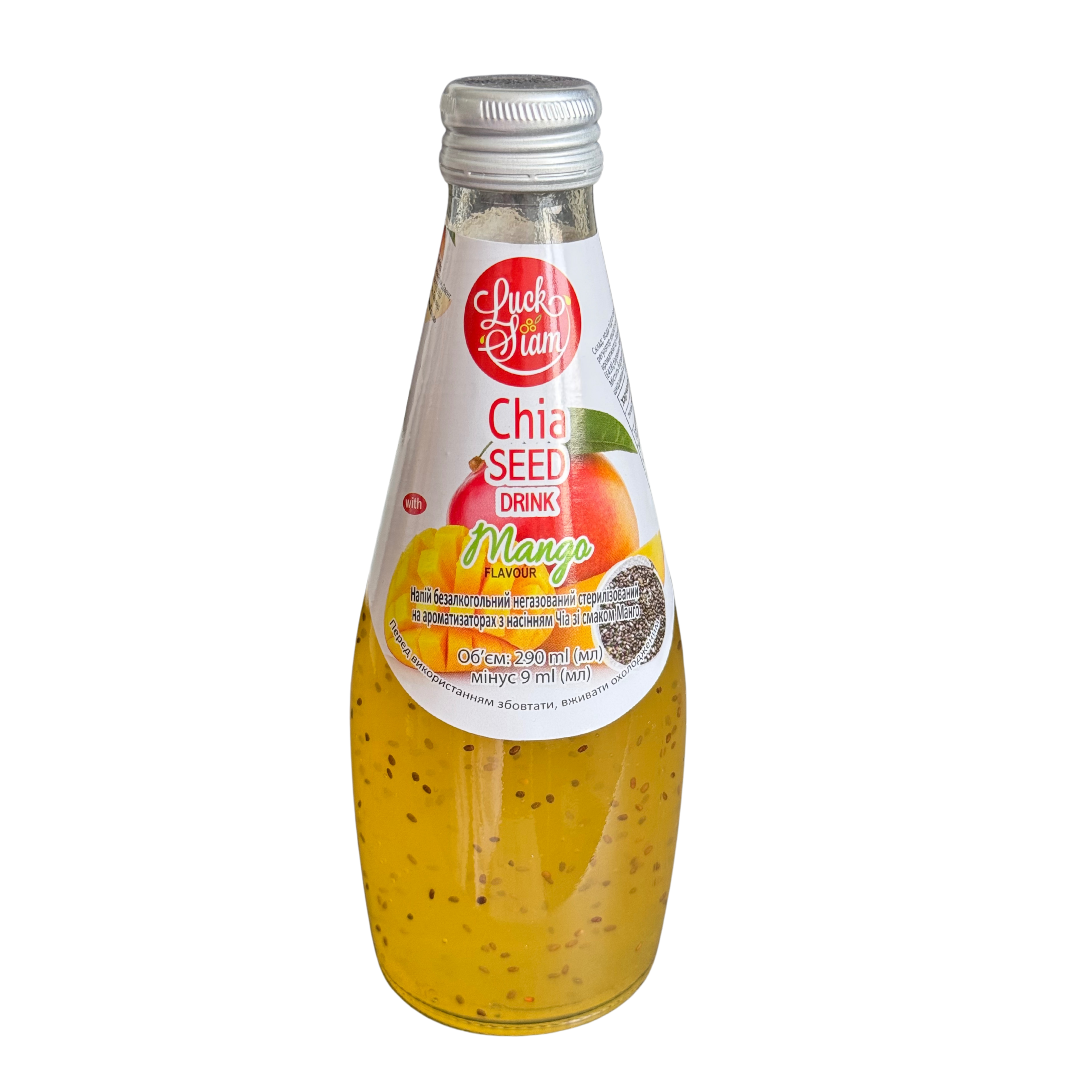 Напій безалкогольний нагазований стерилізований з насінням Чіа зі смаком Манго. Перед використанням збовтати, вживати охолодженим.